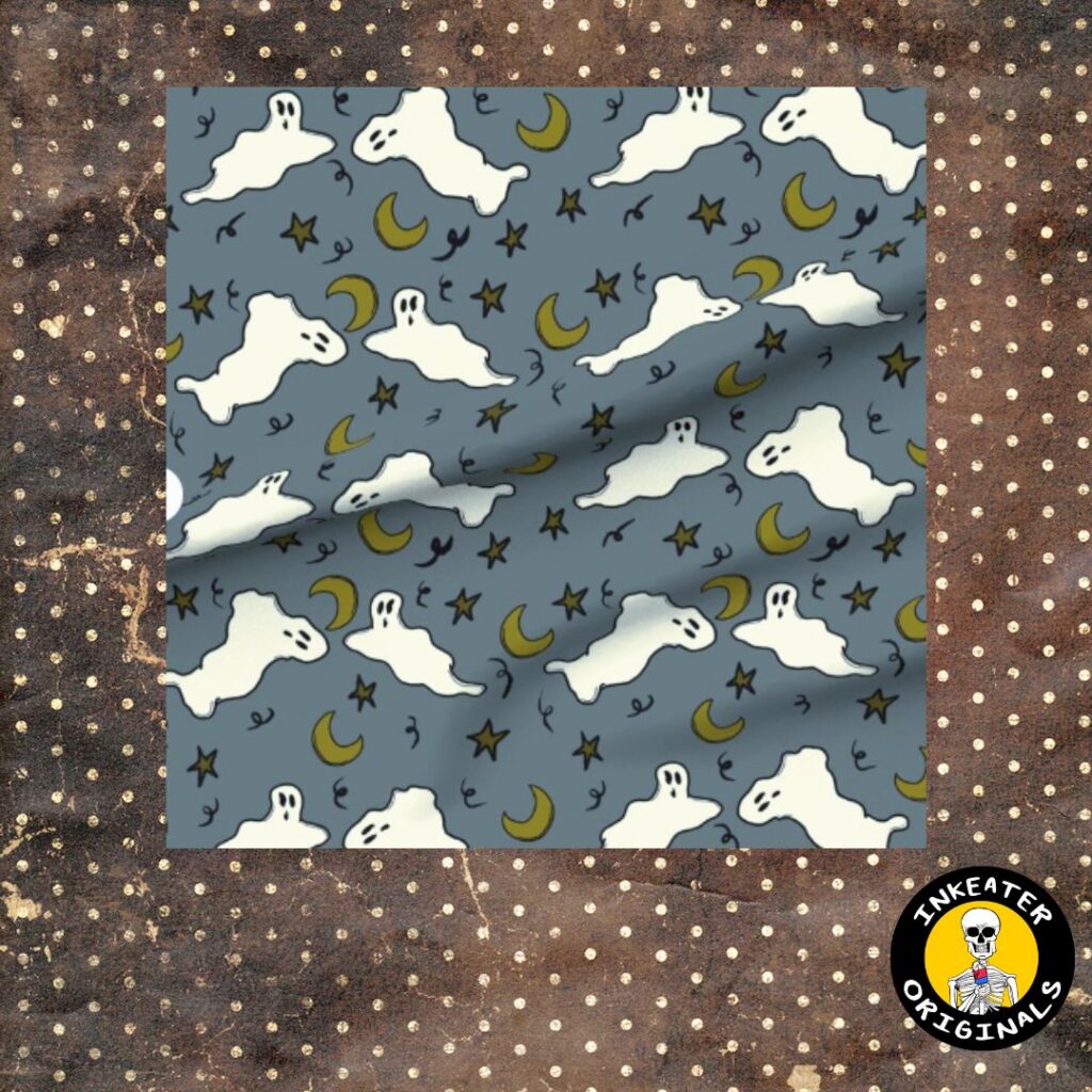 Soft whimsical ghosts drift like clouds among a canopy of stars, rendered in muted grays, off-white, and warm gold tones. This hauntingly beautiful print sits right at the intersection of spooky and serene — perfect for projects that need a little supernatural charm without going full Halloween.